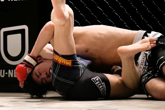 3R、先に打撃で圧力をかける高橋は左ジャブを当てる。右回りの渋井はジャブを突いてダブルレッグテイクダウン! そのまま右にパスしてギロチン狙いの高橋を上から枕で固めてヴォンフルーチョークを極めた。渋井は2試合連続一本勝ち。
