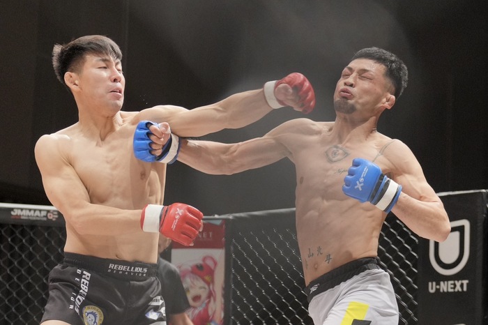 3R、1Rずつを取り合った勝負のラウンド。左ジャブを当てる宮城。渡邉は左の前蹴り。右ローから右アッパー、左の連打の宮城に、左右で押し戻す渡邉は左ジャブ。左フック! さらにダブルレッグも受け止める宮城に深追いせず。
