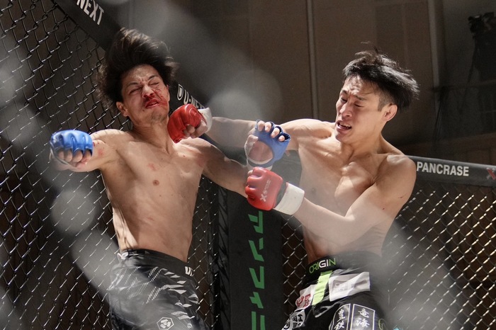 なおもボディロックテイクダウンの清水。長の立ち際にパンチを入れる。オーソに戻す長は右から左、清水も左右の強振で詰めるが、長が左を当てると清水がフラッシュダウン!