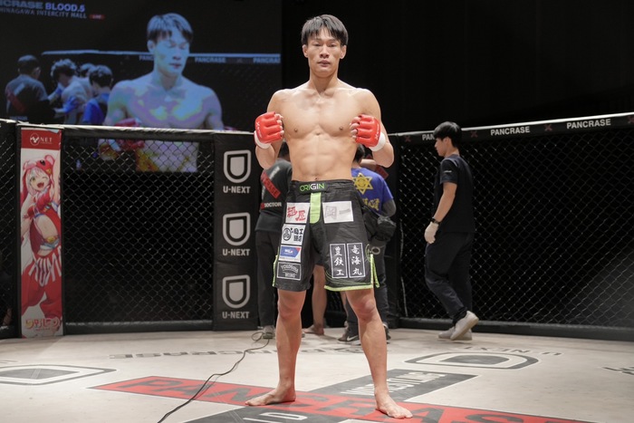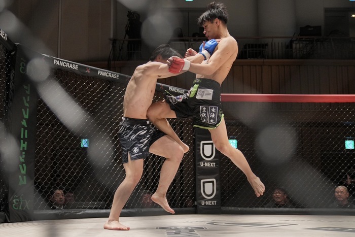 1R、オーソの清水の右に、サウスポー構えの長は左の蹴り。右ローの清水は、ダブルレッグからバッククリンチ、テイクダウン。すぐに立つ長は正対。