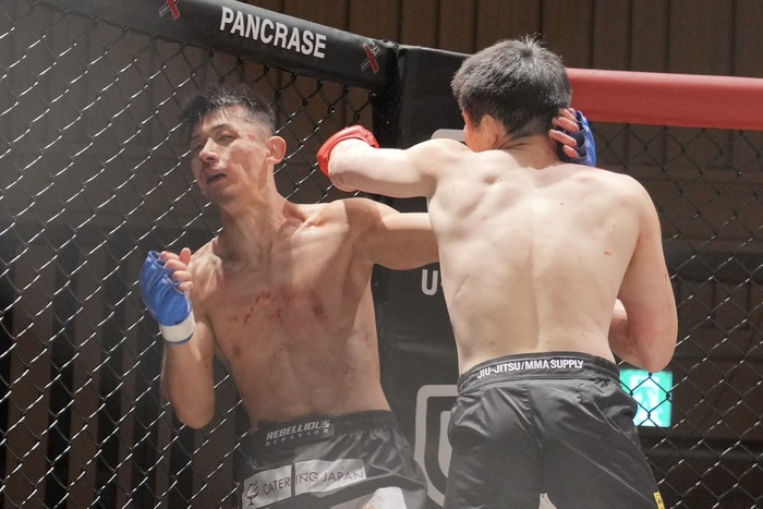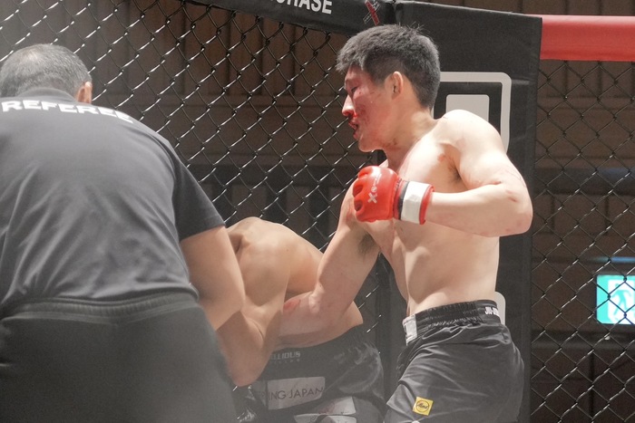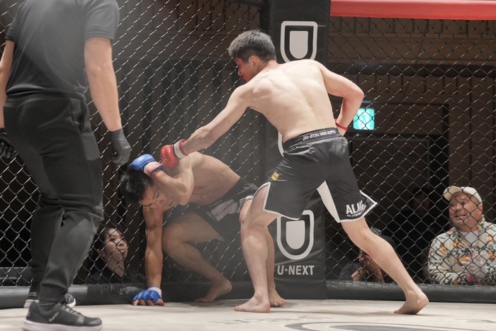 鼻血を流しながらも天野をダウンさせてパウンド。逆転劇を決めた。