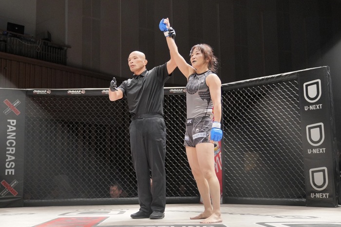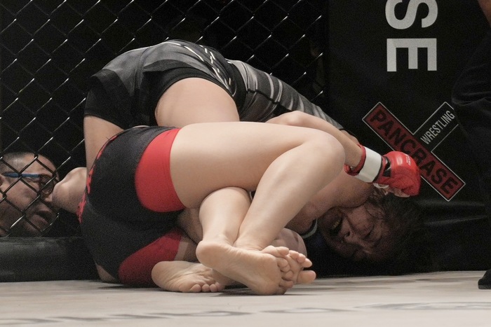 1R、サウスポー構えのナギ。前手の右を突いて小手巻き、オノダマンを投げる。下から左差しのオノダマンはバックに。右足をかけてリアネイキドチョークへ。タップを奪った。51歳オノダマンがプロデビュー戦を勝利した。