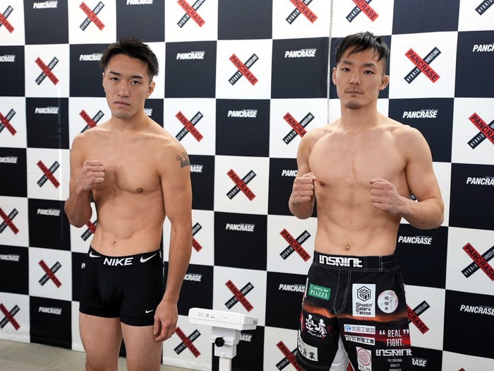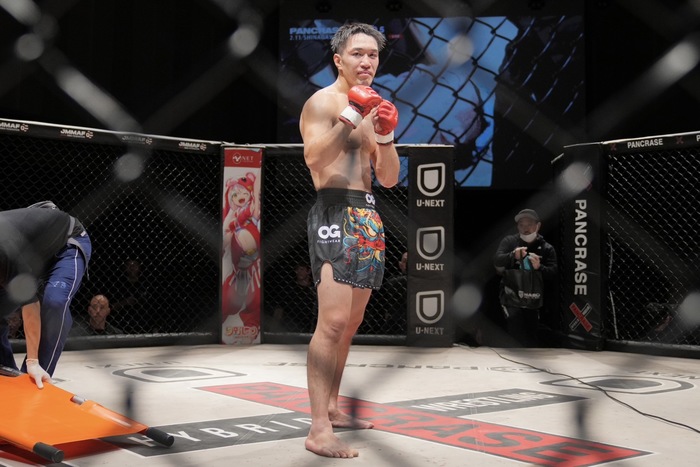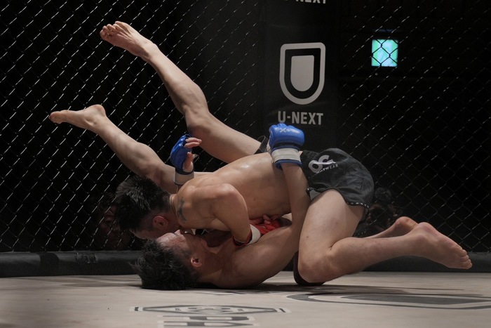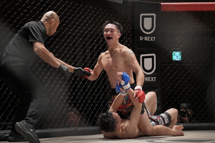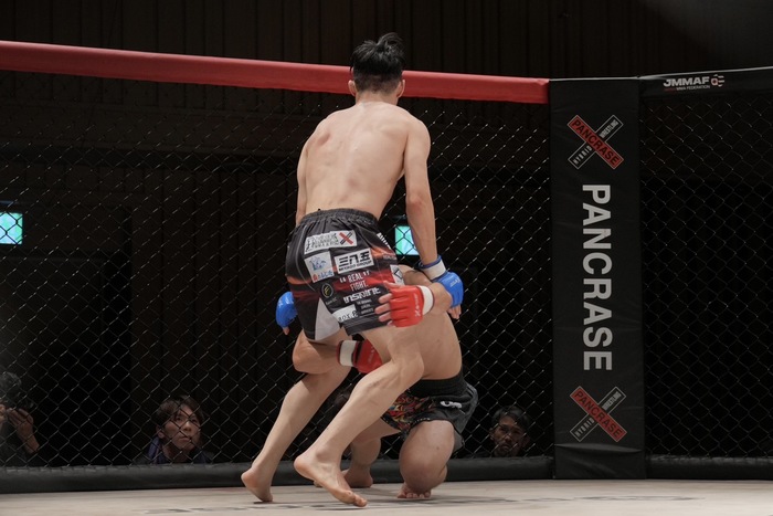 右フックの山田が前に。福里はダブルレッグテイクダウンで足を横に払いスラム! サイドからパウンドに行く福里だが、山田の意識が飛び、すぐにレフェリーが間に入った。