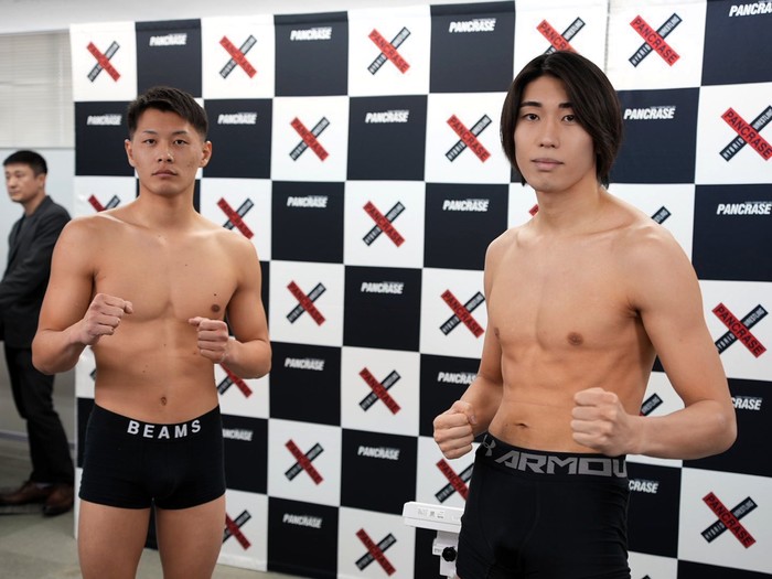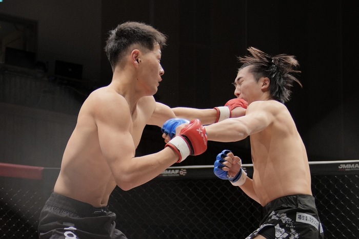 再開、左から右を当てる田口が前に。左差して組む松藤が体を入れ替え押し込み。足をケージにかけて投げようとするが、レフェリーに外され、田口は残す。ブレーク。