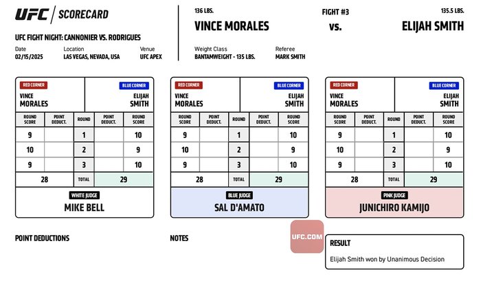 #UFCVegas102 Official Result: Elijah Smith (29-28, 29-28, 29-28) defeats Vince Morales by Unanimous Decision.