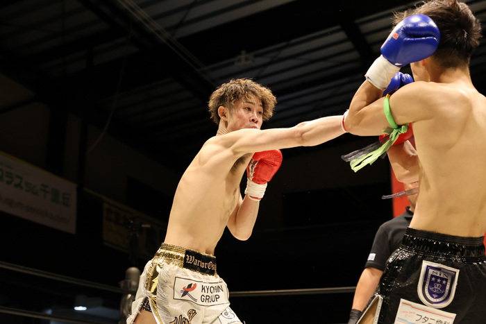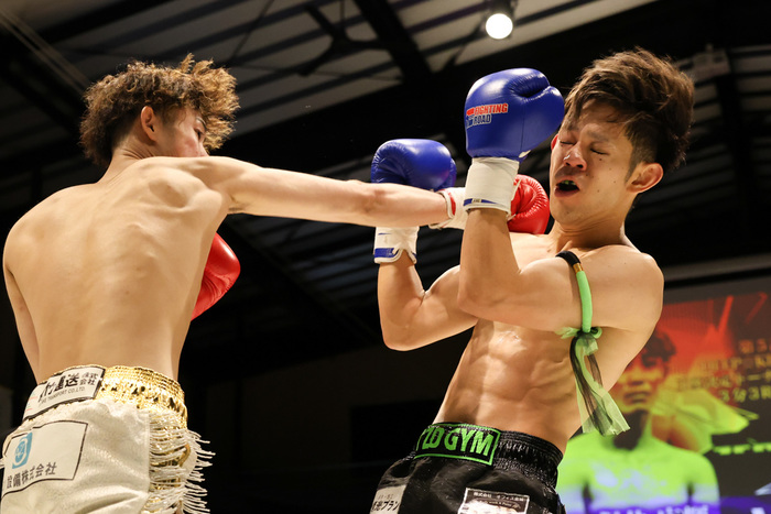 1R、王座奪取を目論むK-1ファイターの保井は左右のボディブローを武器に攻略にかかる。対する弘樹は抑揚のある動きから右フックを繰り出す。筆者の採点ではイーブン。マストなら、やや沖縄出身で現在は大阪在住の弘樹が優勢な展開だったか。