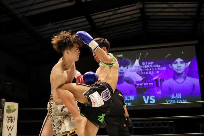 続く2R、リーチの長い保井は左をクリーンヒットさせるも、弘樹も左のテンカオを返して決定打を許さない。それでも諦めない保井は左を追撃さらに左ストレートと右カーフをつなげ、試合の主導権を握る。その後も右のカーフを浴びせていくと、弘樹は足元がフラフラに。