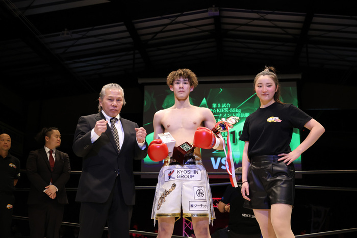 判定は三者とも30-28で保井。もうひとつのトーナメント準決勝は3月大会で行なわれる井上大和(NJKF TOKEN KICKBOXING GYM)vs駿希(BKジム)。その一戦について試合後マイクを握った保井は「昔からお世話になっているBKジムの駿希君とできたらいい」とアピールした。