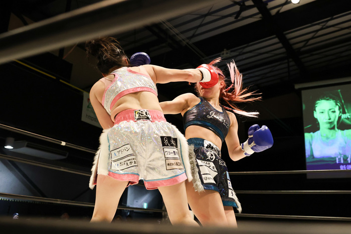 2Rになると、試合が動き出す。前に出てきた上田に対して百花はワンツー。さらに右ローで上田の下半身を削っていく。しかし百花より15歳年下の上田はスタミナも十分。右ストレートをスマッシュヒットさせ、試合の主導権を渡さない。その刹那、政所から百花に「下がるな」という厳しい指示が飛んだ。