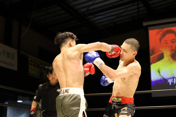 1R、平尾は構えをスイッチしながら右ロー、左ハイなど多彩な蹴りを繰り出していく。お互いスリップダウンを喫する場面もあったが、2Rが終わった時点でのオープンスコアは2者が20-19と平尾を支持した。