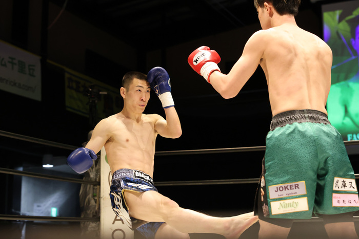 案の定、1R試合を優勢に進めたのは津留の方だった。右のカーフキックを効かせるなど、健真の動きをよく見て仕掛けている。対蹠的に健真は手数こそ多いものの、適正打が少ない。