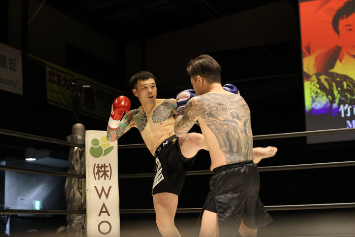 1Rから竹市は左のストレートやカーフキックで勢いよく攻め込む。左がクリーンヒットすると、溝口の足が止まる場面も。ラウンド終了間際にはパンチの連打で先制のダウンを奪った。竹市のKO勝ちは時間の問題かと思われたが、2R以降の溝口の粘りはすさまじかった。竹市に攻め込まれても倒れる素振りを見せない。逆に竹市が攻め疲れしているようにも見えた。