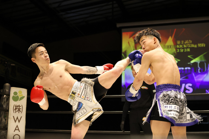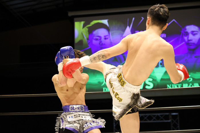 ゆいらは計量で300gオーバー。規定時間内にクリアできなかったため、協議の結果、ゆいらに減点1とグローブハンディを課したうえで試合は成立することになった。1R開始早々、大輝は左ハイを連打してゆいらの右腕を殺しにかかる。