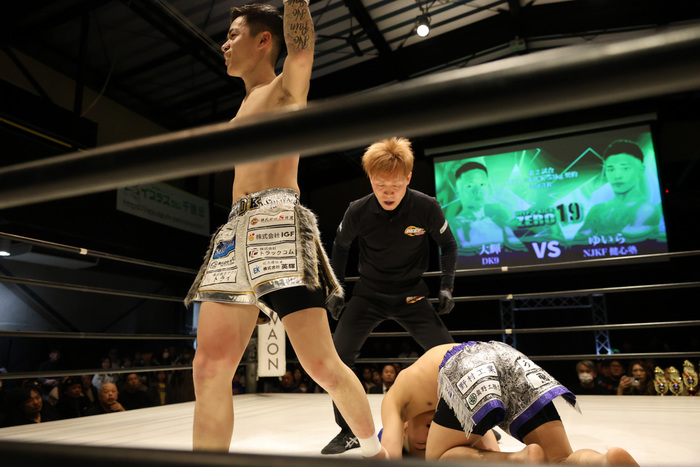 さらに左の三日月をボディに突き刺したかと思えば、続けざまにテンカオを決めるなどボディへの攻撃も忘れない。その後も左の攻撃を畳みかけ、とどめは左ストレート。なんとか立ち上がってきたゆいらだったが、足元がフラついていたので、レフェリーは試合を止めた。1R2分51秒、大輝のTKO勝ちだ。