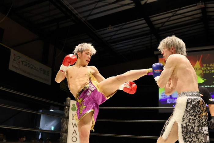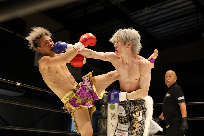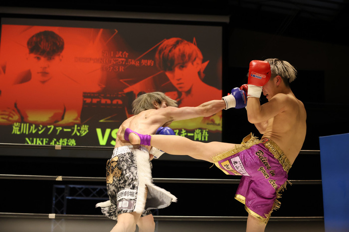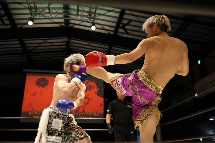 1R、サウスポーのルシファーは左のミドルやミドルハイ(肩口を狙った打点の高い蹴り)を連打して相手の右腕を殺しにかかる。しかしそんなことはお構いなしにクレイジーハスキーは十八番の右フックを打っていく。2Rになると、ルシファーの攻撃はさらに加速。左ストレートやテンカオを織りまぜながら、ハスキーを攻略しにかかる。
