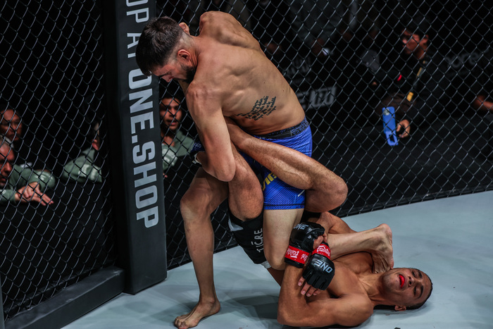 すぐにバックから4の字、ボディトライアングルに組み、背後からパウンド、マウントに移行し、強いパウンド。肩固めへ。ヴィーニャはレフェリーの足にタップした。