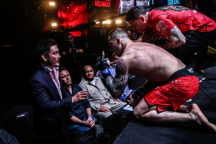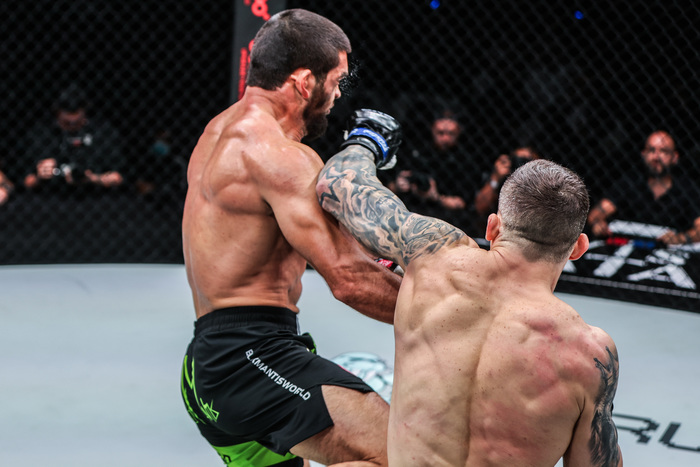 圧力をかけるアサラナリエフの右ミドルに、ソルディッチはカウンターの左! カウンターでアゴを打ち抜かれたアサラナリエフは、飛び上がったまま後方に倒れて、パウンド。レフェリーが間に入った。