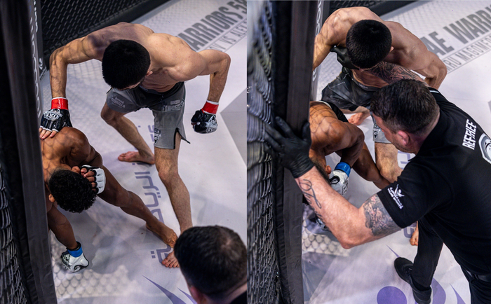 サウスポー構えになるシウバ。オーソに戻すと、マゴメドフはワンツーから左三日月蹴り! シウバはくの字になってケージまで下がりしゃがみこむと、マゴメドフは左のパウンド連打! 片ヒザ立ちのまま動けないシウバを見て、レフェリーが間に入った。