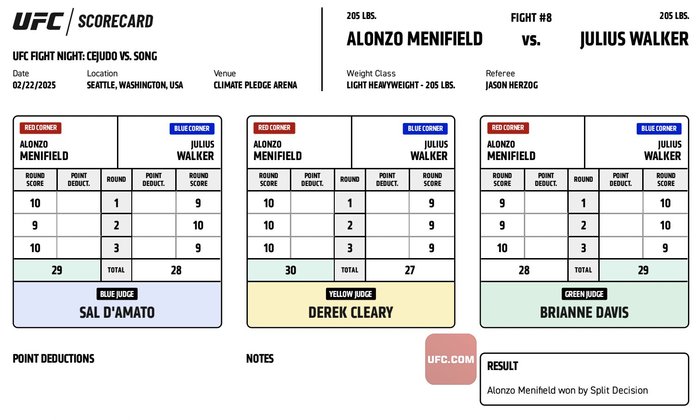 #UFCSeattle Official Result: Alonzo Menifield (29-28, 30-27, 29-28 | @AlonzoMenifield) defeats Julius Walker by Split Decision.