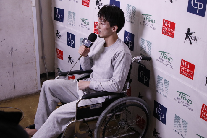 試合後のインタビューには車椅子で現れ、「過酷すぎました。1試合終わって回復する時間が全然なくて疲れ切った状態で準決勝、決勝でした。足は準決勝も厳しいなって感じで。足で倒れなくない、その気持ちで戦いましたが、準決勝で狙われて1R危なかったです」と振り返り、優勝できた要因は「気持ちですかね。準決勝、決勝は気持ちでした」と強い気持ちで乗り切ったと語った。