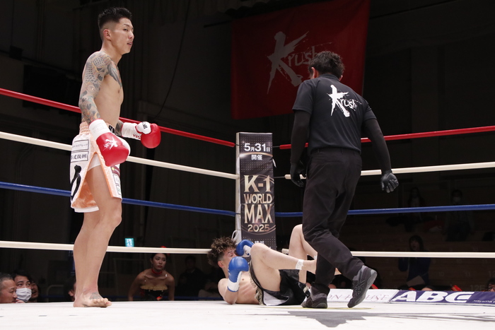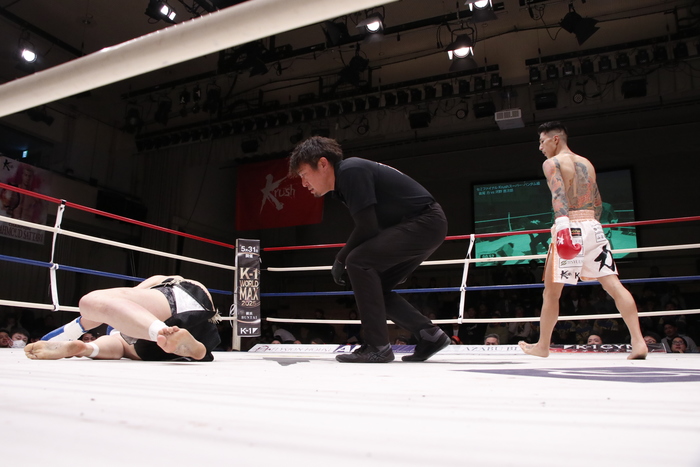 2Rも左右ボディで攻める岩尾。強烈な左ボディを決め、右フックでダウンを奪う。最後は矢のようなワンツーで右ストレートをさく裂させ、強烈なダウンを奪ってKO勝ち。