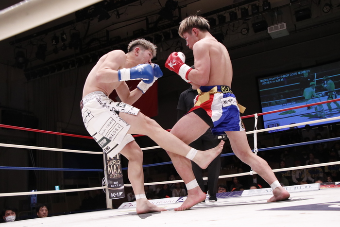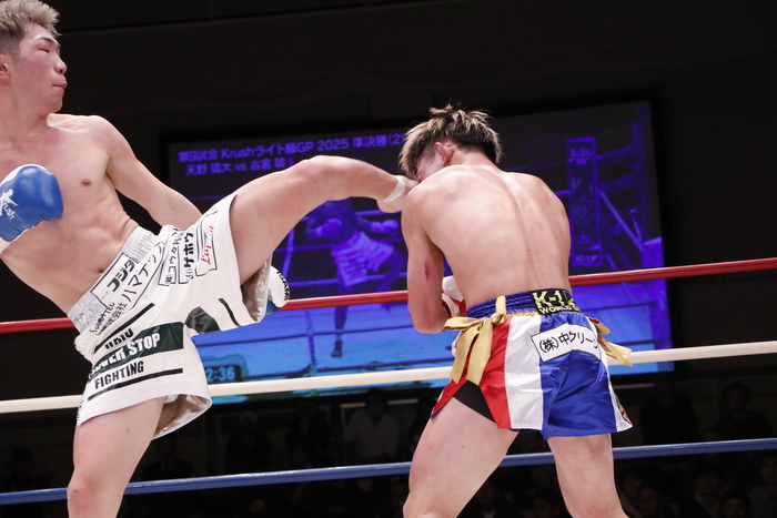 2R、伸びのある右ストレートをしっかり当てていく古宮は、左ボディもヒットさせる。天野は前へ出て負けじと左ボディ。それでも手数やヒット数が多いのは古宮。終盤には得意の顔面前蹴りを2発見舞い、均衡を破った。天野はハイキックを放つ。
