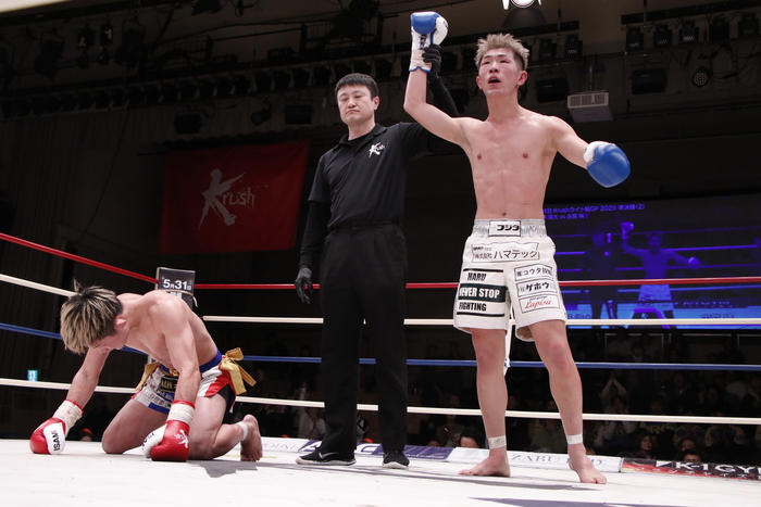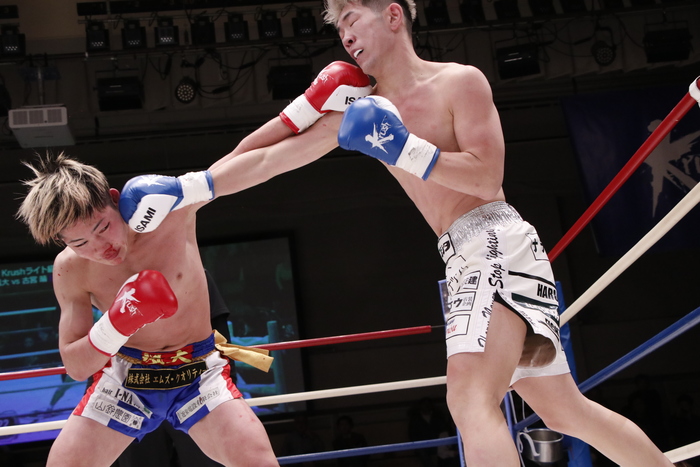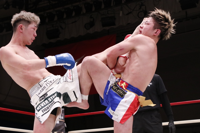 3R、天野が距離を詰めていき、逆に顔面前蹴り。左右フックを打って行く天野に古宮は至近距離からでも高い蹴りを打ってくる。ガムシャラに攻める天野は身体で押していき、最後は左右フックを振り回す。古宮も譲らず打ち返し、意地の張り合いとなった。