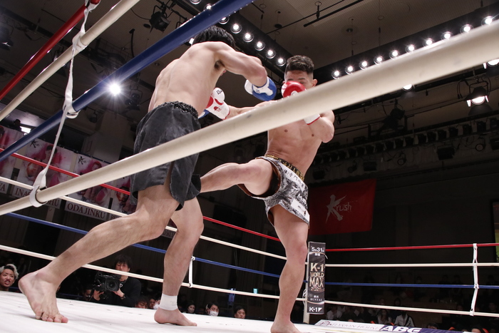 1R、のしのしと前へ出る昇也が西京の1回戦でダメージを負った左足を狙い撃ち。西京はローを蹴ってくる昇也のワンツーを打って行く。これにローを蹴りにくくなったか、昇也がパンチに切り替え、西京が右フックでダウン気味に昇也をスリップさせた。