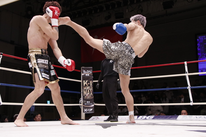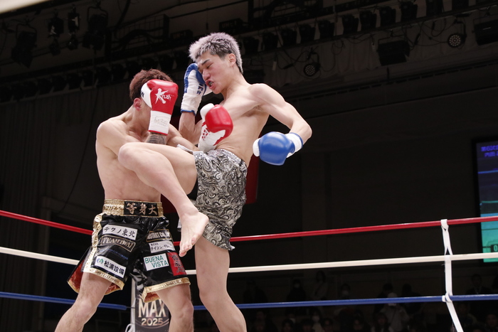 2Rもスピードで先手をとっていった齊藤が左ヒザを突き上げ、チャンスをつかむ。ここで齊藤がパンチをまとめるも、内田も左ミドルからの右ストレートで逆襲。カーフを蹴っていく。