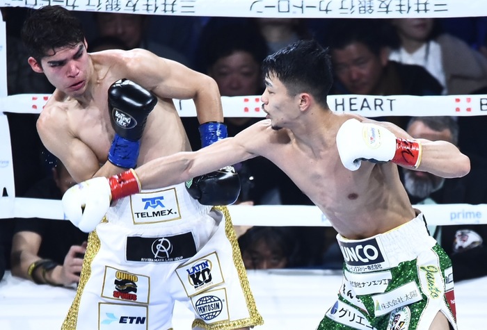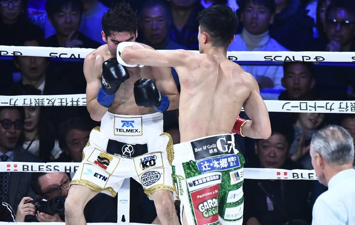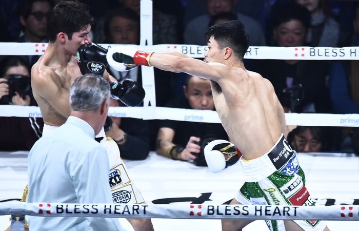 左ボディから右フックのクエジャルをさばいた中谷は、左ボディを効かせると、近い距離で右ショートの打ち降ろしをヒット。さらに左ボディ、右フック、左ストレートとラッシュでダウンを奪った。