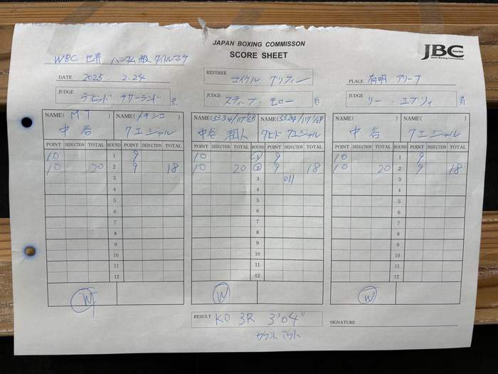 立ち上がったクエジャルに大きくふりかぶった左フック、さらに右左と繋ぐと、クエジャルは2度目のダウン。ロープ背に座り込んだクエジャルは立ち上がれず。中谷が3R KO勝ちした。