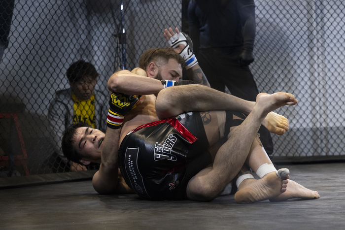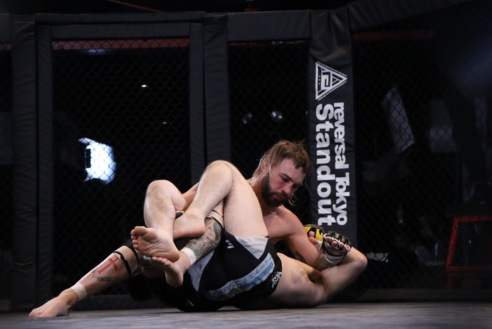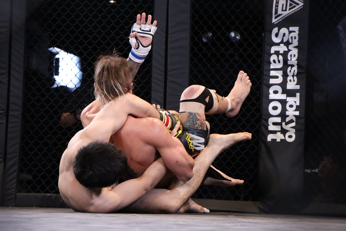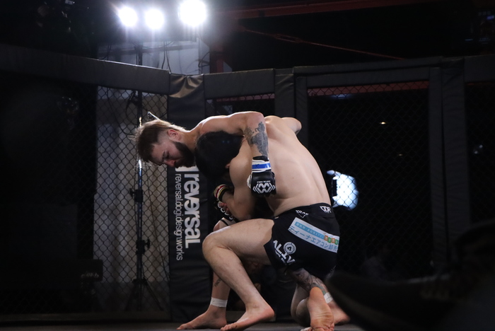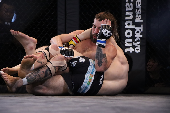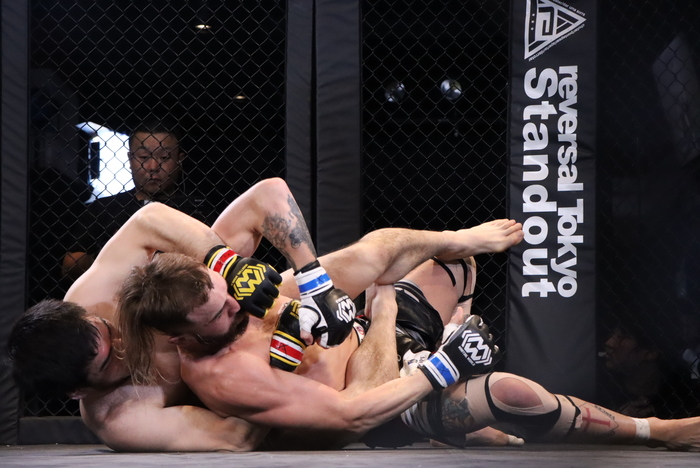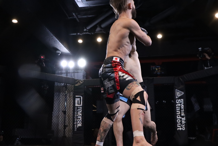1R、サウスポー構えの竹本にオーソのガーダム、竹本はインロー前手のフック。ガーダムは右ストレートで入るが、竹本はシングルレッグからハーフに引き込み、両足をまたいで束ねてからバックテイク。ツイスター狙う
