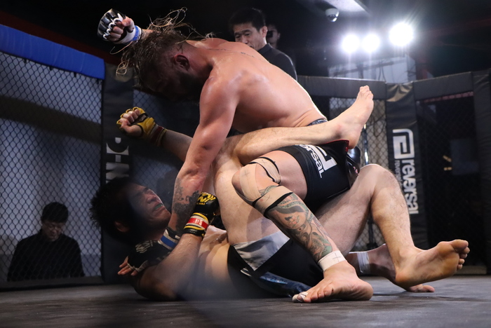3R、ジャブを刺し、竹本は手を掴んで引き込みハーフも脇差すガーダム。潜りを許さず押さえ込みながら細かくヒジを落としてゴング。ガーダムは練習仲間の竹本に「すごいよ」とハグし、咆哮した。