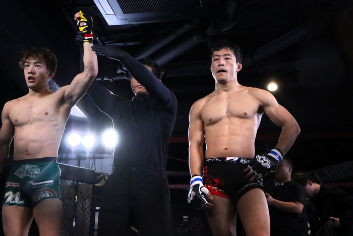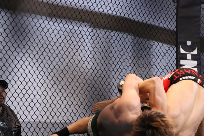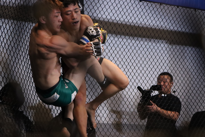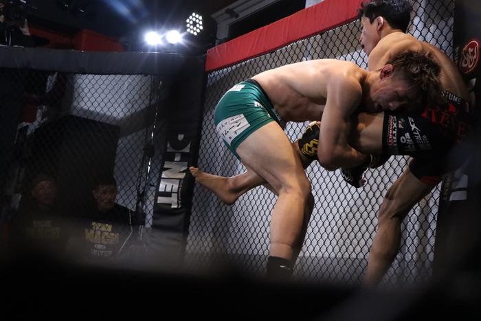 1R、山崎の後ろ廻し蹴りの打ち終わりに組んだジュンウに首投げの山崎。しかし脇差すジュンウは立ち上がり。脇差し押し込みに小手巻き、ヒジを落とす山崎。最後にギロチンで回してゴング。