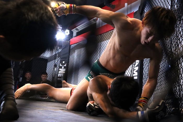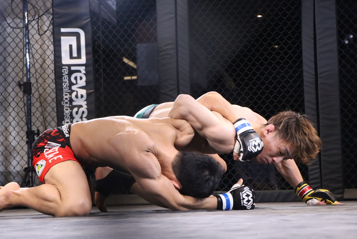 2R、左右の打撃で前に出る山崎はシングルレッグテイクダウンからバック。リアネイキドチョークを狙い、最後はバツクマウントからパウンドをまとめるとレフェリーが間に入った。