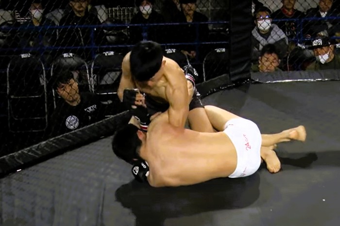 さらに詰めて左にダブルレッグからハーフガードで引き込み。大谷は下から脇を差すが、左小手巻く堀江は、大谷を潜らせず、トップから鉄槌、右ヒジ、左右パウンド連打!