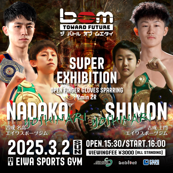 吉成名高、奥脇竜哉、品川朝陽、吉成士門ら本場タイのリングでもトップ選手に勝てるムエタイファイターを輩出したBOMプロモーションが主催するJr.ムエタイ選手育成大会『bom TOWARD FUTURE』。2025年3月2日(日)神奈川・エイワスポーツジムにて開催される第1回大会の追加対戦カードが発表された。