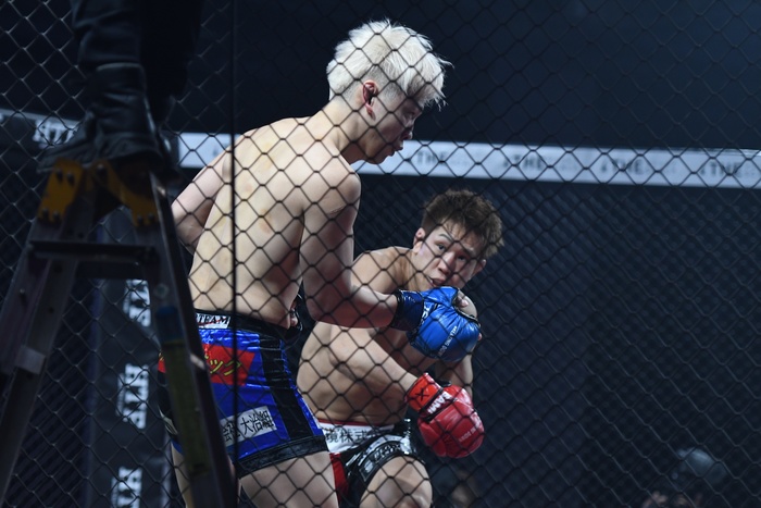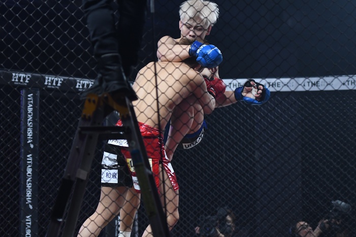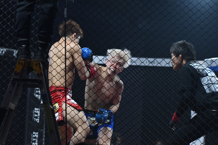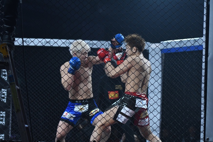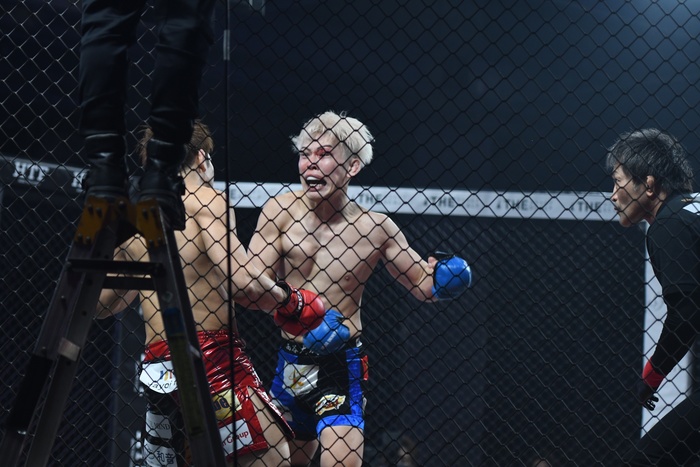 1R、白川は頭を左右に振り、左右フックから左ハイ。西谷は右フックを繰り出すが、白川は細かくパンチを出してしっかり当てていく。