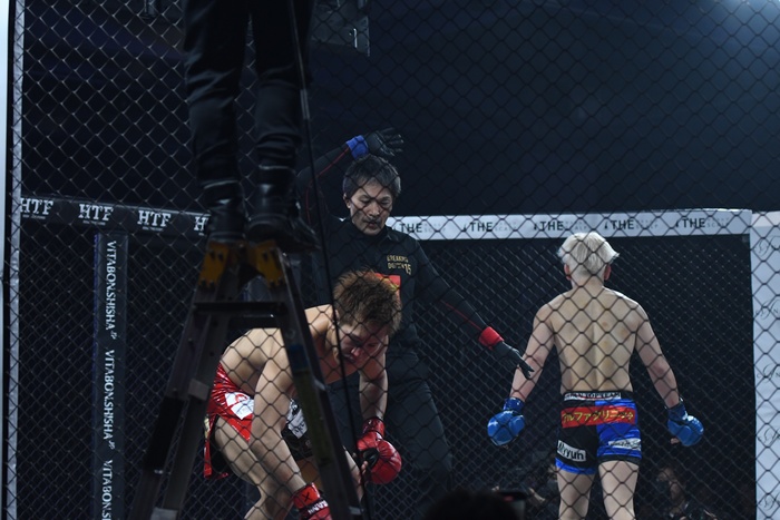 立ち上がった白川に、連打で襲い掛かる西谷に押されるように倒れ込んだ白川。しかし、立ち上がると足を痛めたらしくすぐに座り込んでしまった。右足をひねったようだ。レフェリーが試合をストップし、西谷のKO勝ちとなった。