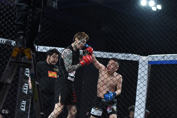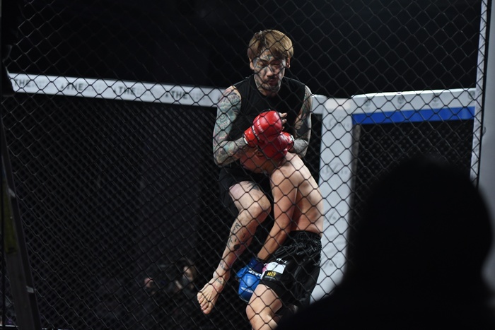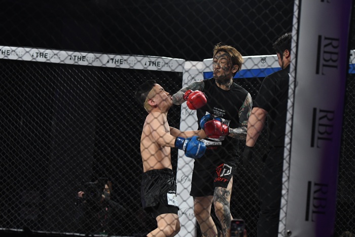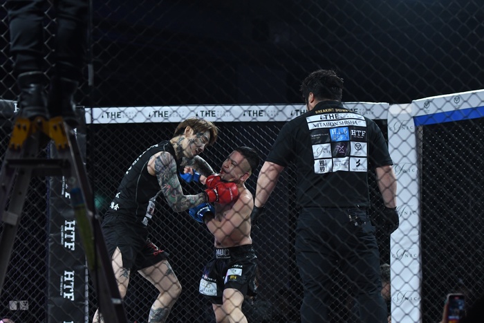 身長差はかなりある。蹴りを多用する瓜田にせーやは潜り込んでパンチを放って行くが、瓜田のヒザをもらう。ガムシャラにパンチを振る回すせーやに対し、瓜田は打ち下ろす右。瓜田の右フックにせーやがグラつく。さらに覆いかぶさって楽々と顔面へと届くヒザ蹴りを見舞う。