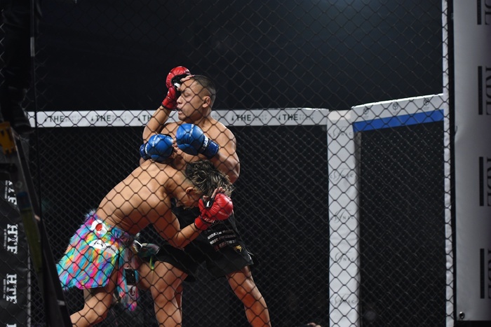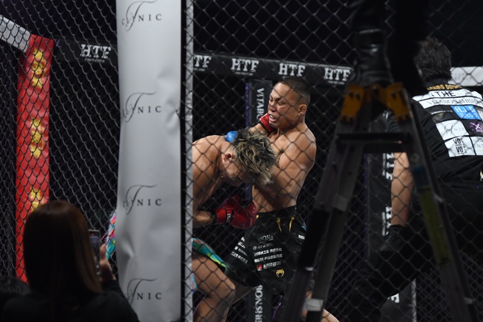 2R、圧をかけて前へ出ていく加藤にとしぞうはジャブ、右ストレート。加藤はパンチに頭を下げるとしぞうを首相撲にしてヒザを突き上げていく。