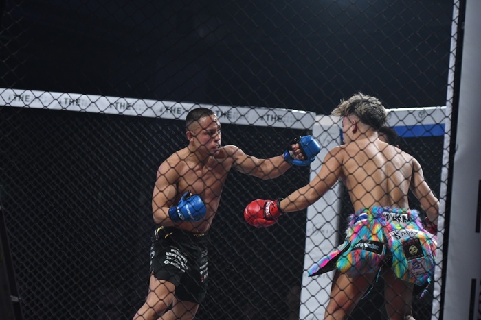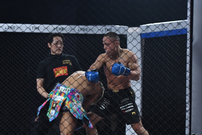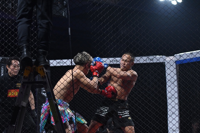 1R、としぞうはジャブ、加藤は左フックを振るって前へ出ていく。としぞうはヒザ、右ストレート。