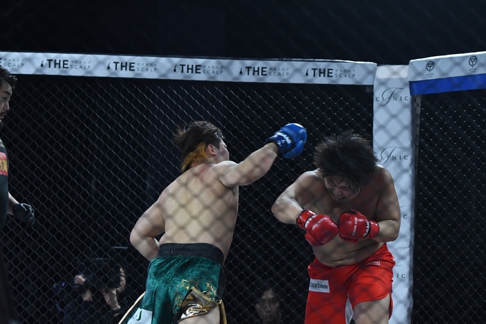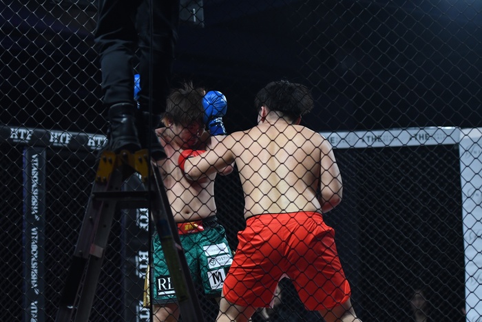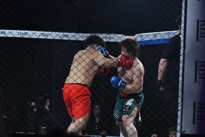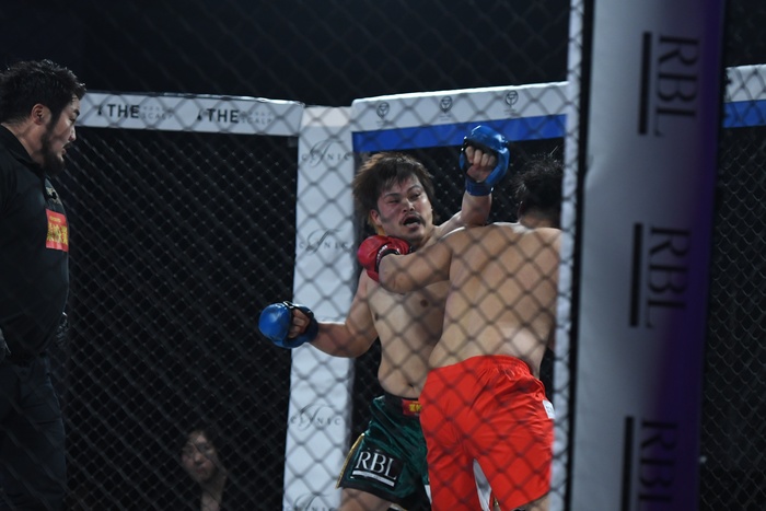 てるが左ミドルから左右フックで突進。赤パンも負けじと足を止めて左右フックで打ち合う。勢いはてるがあるが、赤パンの左右フックがヒット。てるは下がり、そこへ赤パンが組んでのヒザ蹴り。右ローから右ストレートを放ったてるの一撃が赤パンを捉え、赤パンがペースダウン。攻め込むてるだが赤パンは手を広げて効いてないアピール。