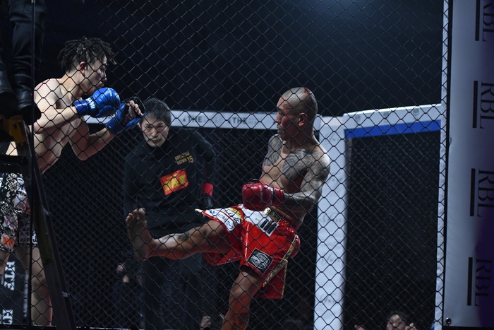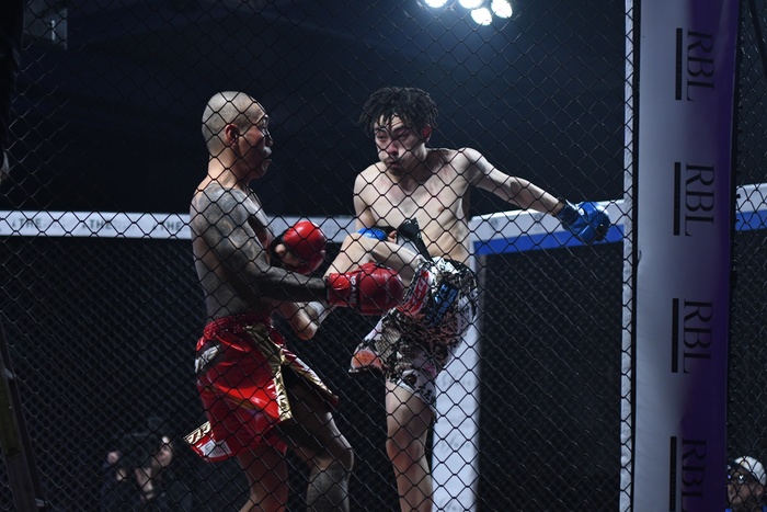 序盤から足を止めて打ち合う両者。右ローも蹴り合う。前に出て勢いをつける三河に村田はそれをかわしながら的確な右を入れる。ならばと三河は組んでのヒザ。