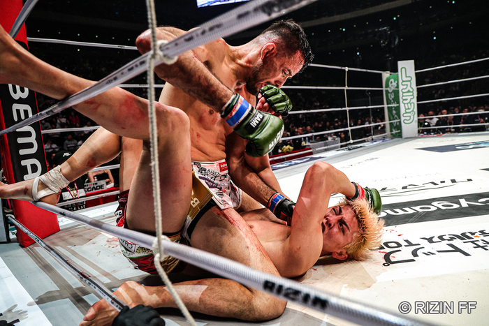 徹底的に久保の試合映像を分析するなか、『序盤は組まない』作戦で立ち合い、久保の左ハイをガード後、1分過ぎにボディロックテイクダウン。腕十字、リアネイキドチョークを狙いながらも強いパウンドでダメージを与えて2R TKO勝ちを収めている。