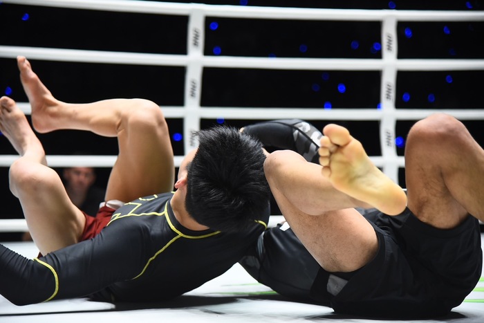 かつぎパスを狙うヘイスにインバーテッドで越えさせない石黒。腰を抱き、サイドに飛ぶヘイスはパスガード。上四方を狙いながら石黒が腹ばいになると首を狙う。再びガードに戻す。