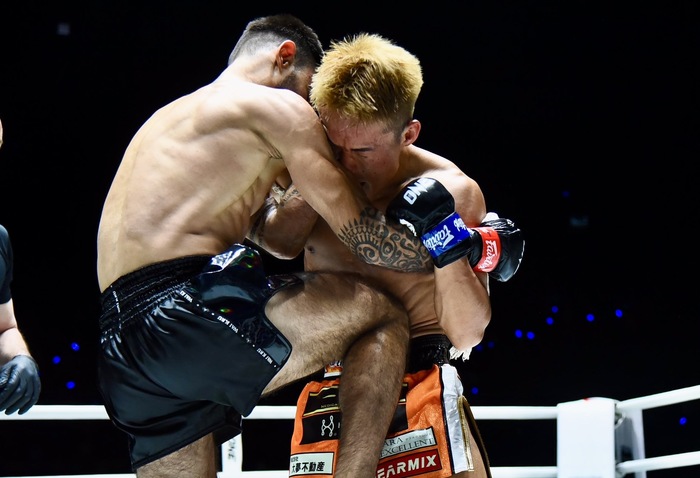 2R、コロディはジャブから首相撲も北野がまたも崩し倒す。それでもしつこく首相撲に持ち込んでいくコロディが北野に蹴らせない。またも左ミドルからの左ハイをヒットさせる北野。ワンツーとヒザで接近戦を仕掛けるコロディに北野は下がらず応戦するが、コロディは首相撲からヒジに持ち込む。コロディがペースをつかんだ。