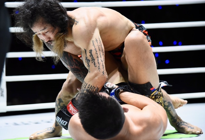 2R、バータルフーはスイッチしながら近付いていき、パンチのフェイントからシングルレッグでテイクダウンを奪う。サイドからまたも左腕を取りに行くバータルフー。今度はバックを取りに行きブルドッグチョークを仕掛けるがこれはパカティウがすぐに外す。起き上がったパカティウはすぐにバックを取りに行き、腕十字を仕掛けるもバータルフーはすぐに対処して上から抑え込む。サイドから顔面へヒジを落とすバータルフー。