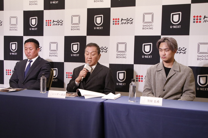 この言葉を聞いたシーザー会長は「いいね。それくらいの気持ちでやって欲しい」と頬をほころばせ、「これは全員に言いたいんだけれど、SBはキックボクシングの第二次団体ではない。キックボクシングみたいな試合をしていると、U-NEXTを観ている人は『なんだ、一緒じゃないか、スパッツを履いてるだけじゃないか』と思ってしまう。だからSBはこう面白いんだということをみんなで表現してほしい。そこを選手みんな、心に秘めて試合をしてほしいと思います」とシュートボクサーたちにメッセージ。笠原に「ミンチはいいね(笑)。期待しているから」と激励した。
