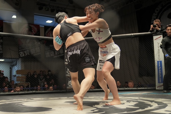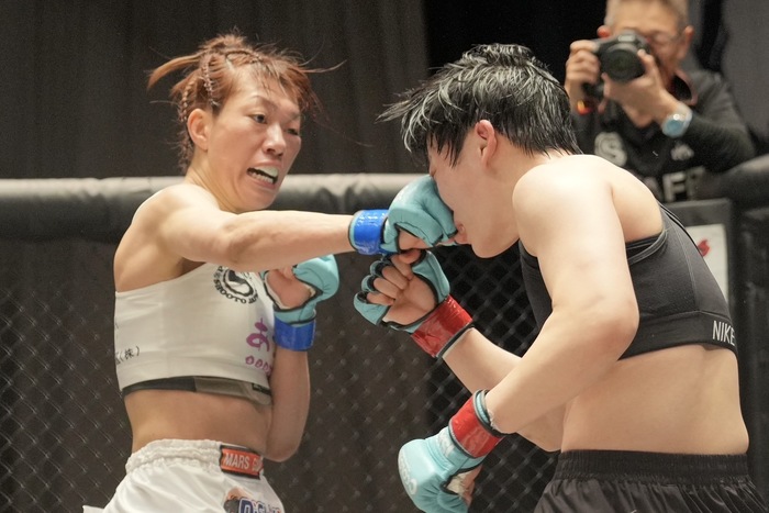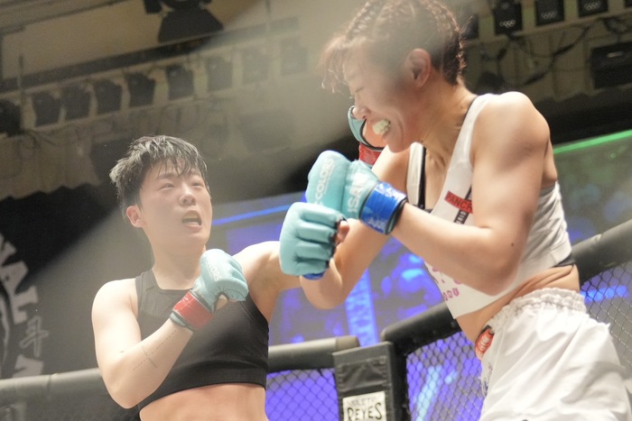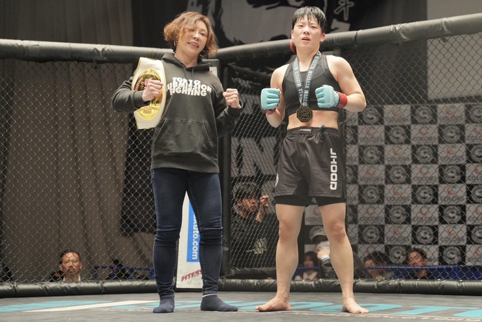 ケージサイドで観戦していた元女子ストロー級子王者の藤野がベルトを持ってケージインすると、「ボヒョン選手、めちゃくちゃ強くて気持ちがいい選手だったので、やりたいなと思って上がってきました」とマイクし、両者がフェイスオフ。